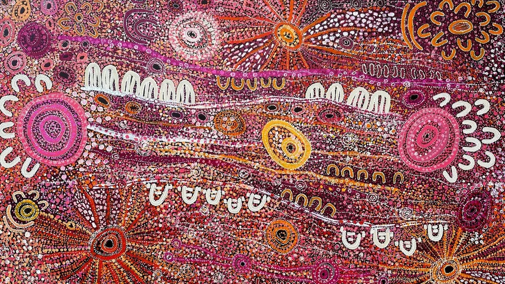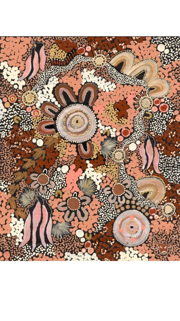My aunty, Charmaine Pwerle, preserves a legacy of love, strength and cultural continuity through her brushstrokes and dot work. This painting (above) captures the final story passed down to her by her late mother, Barbara Weir, a deeply sacred narrative about traditional childbirth practices in the bush.