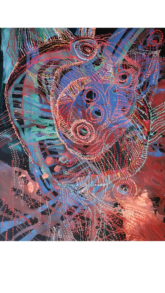 This work reflects Emily’s profound connection to her ancestral country, Alhalkere. Through vibrant colour fields and rhythmic dotting that illustrate the seasonal bloom of desert flora, she captures the spiritual and ecological cycles of the land.
