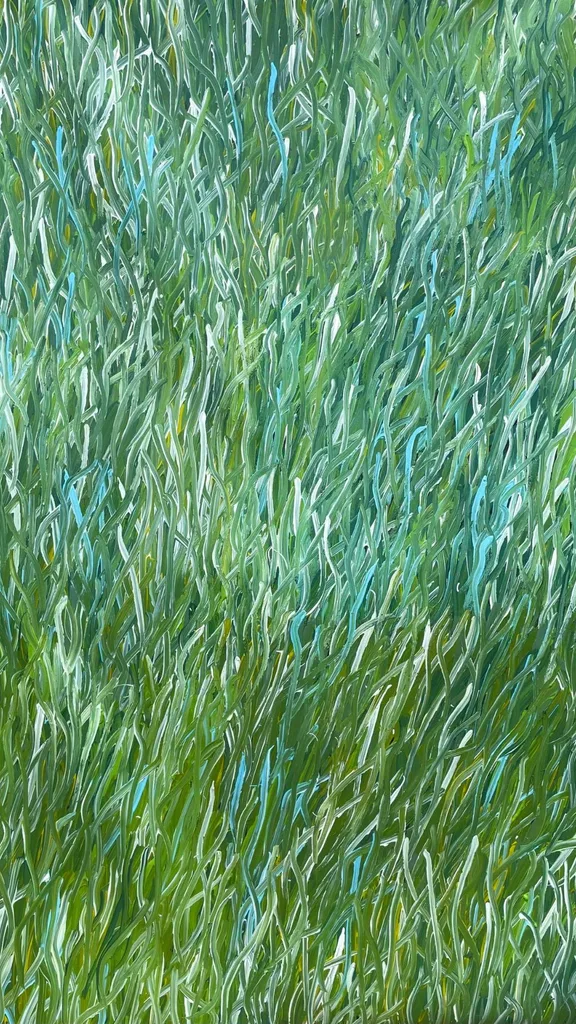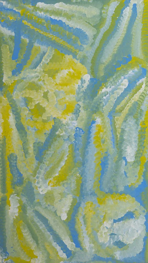 This painting pays homage to the healing plants of her heritage, particularly the Kurrajong tree’s leaves, which are used in medicinal preparations. Her swirling brushstrokes reflect the movement of the leaves, the plant’s vitality, and its significance in Aboriginal culture.