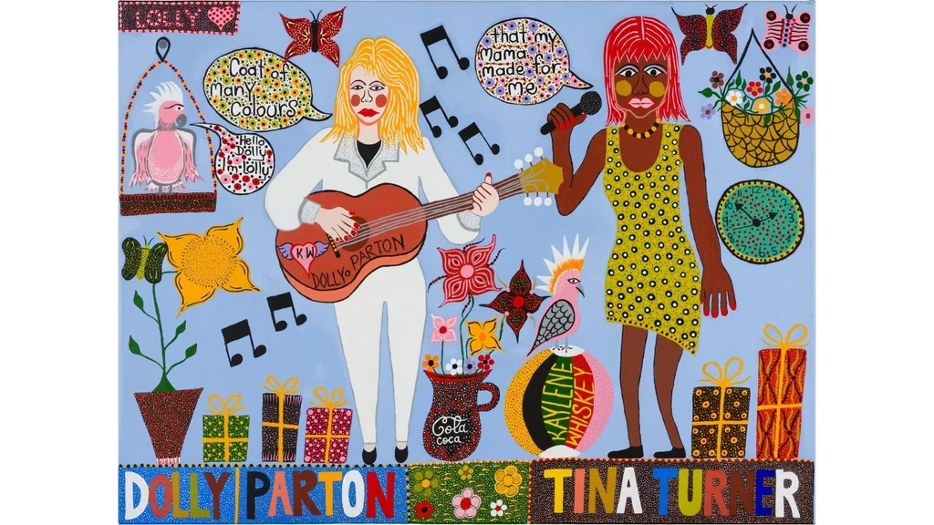 Kaylene Whiskey’s vibrant, detailed paintings celebrate strong Aboriginal women, often blending pop culture icons such as Wonder Woman and Tina Turner with life in her remote desert community.