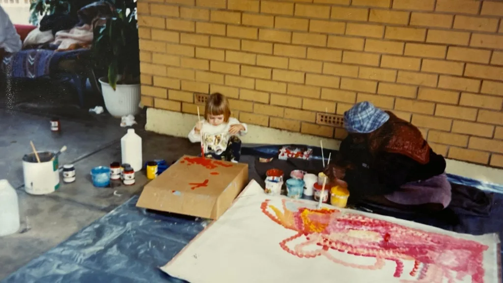 Growing up surrounded by their paintings, stories and deep connection to Country shaped me in ways I didn’t even realise at the time. Art wasn’t just something we did, it was something we lived. Every painting carried knowledge, stories and a responsibility to keep that connection alive.