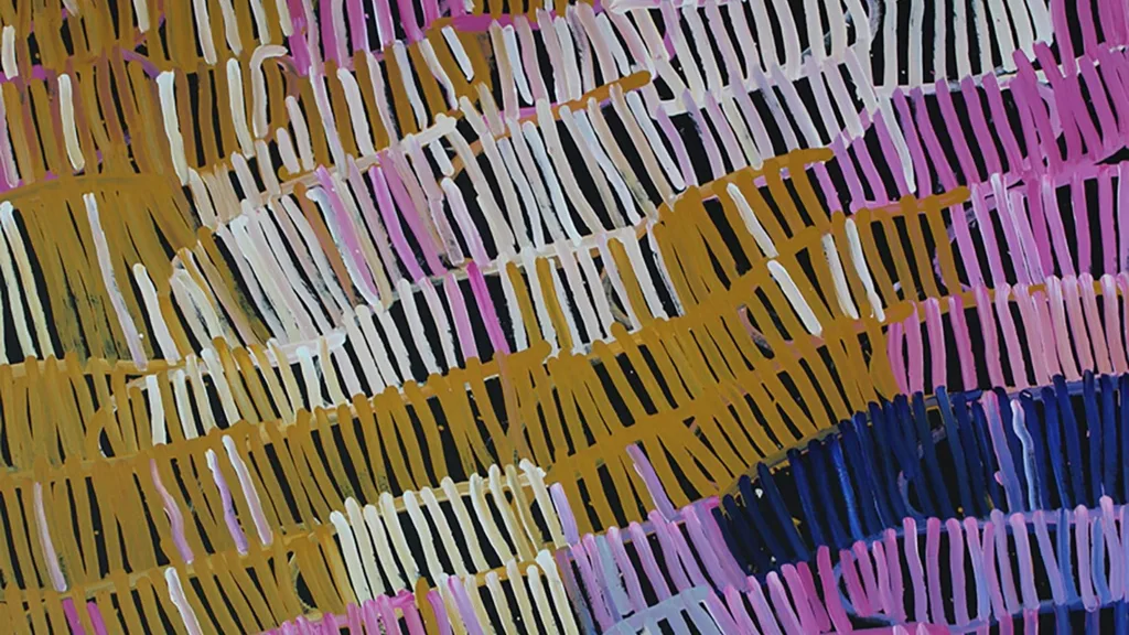 My great-grandmother, Minnie Pwerle (who I named my gallery after), painted with unstoppable energy. This work represents women’s ceremonial body-painting designs.