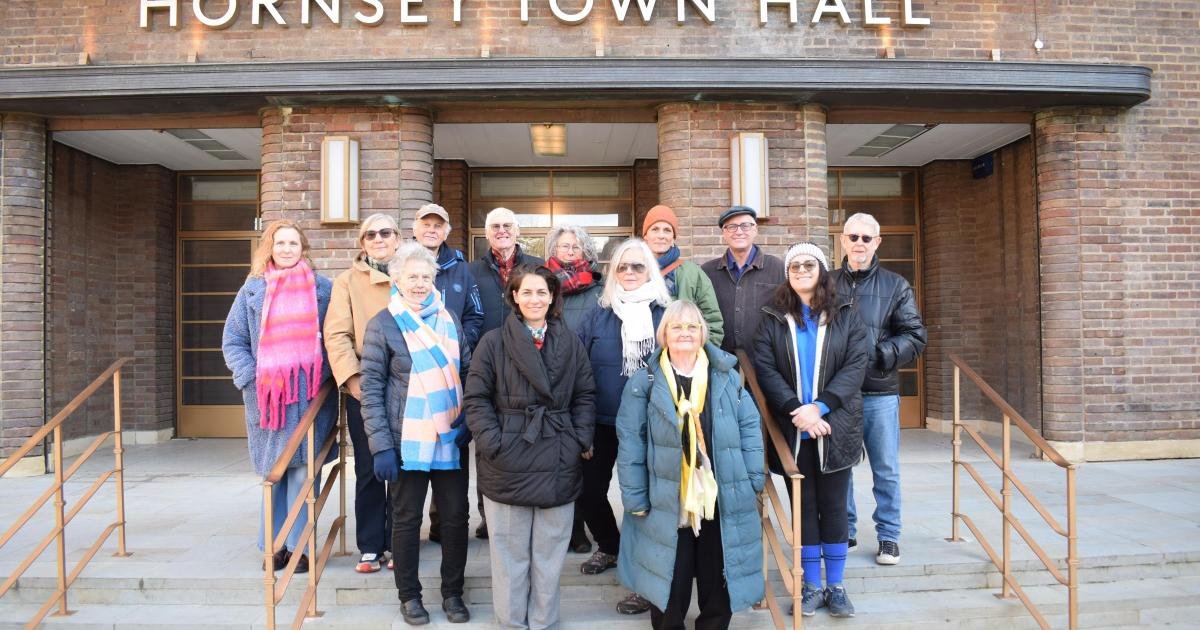 Sue Davidson (3rd from left) with Crouch End Open Studios artists in the Committee Room where their exhibition will be held (Image: Marie Mangan)