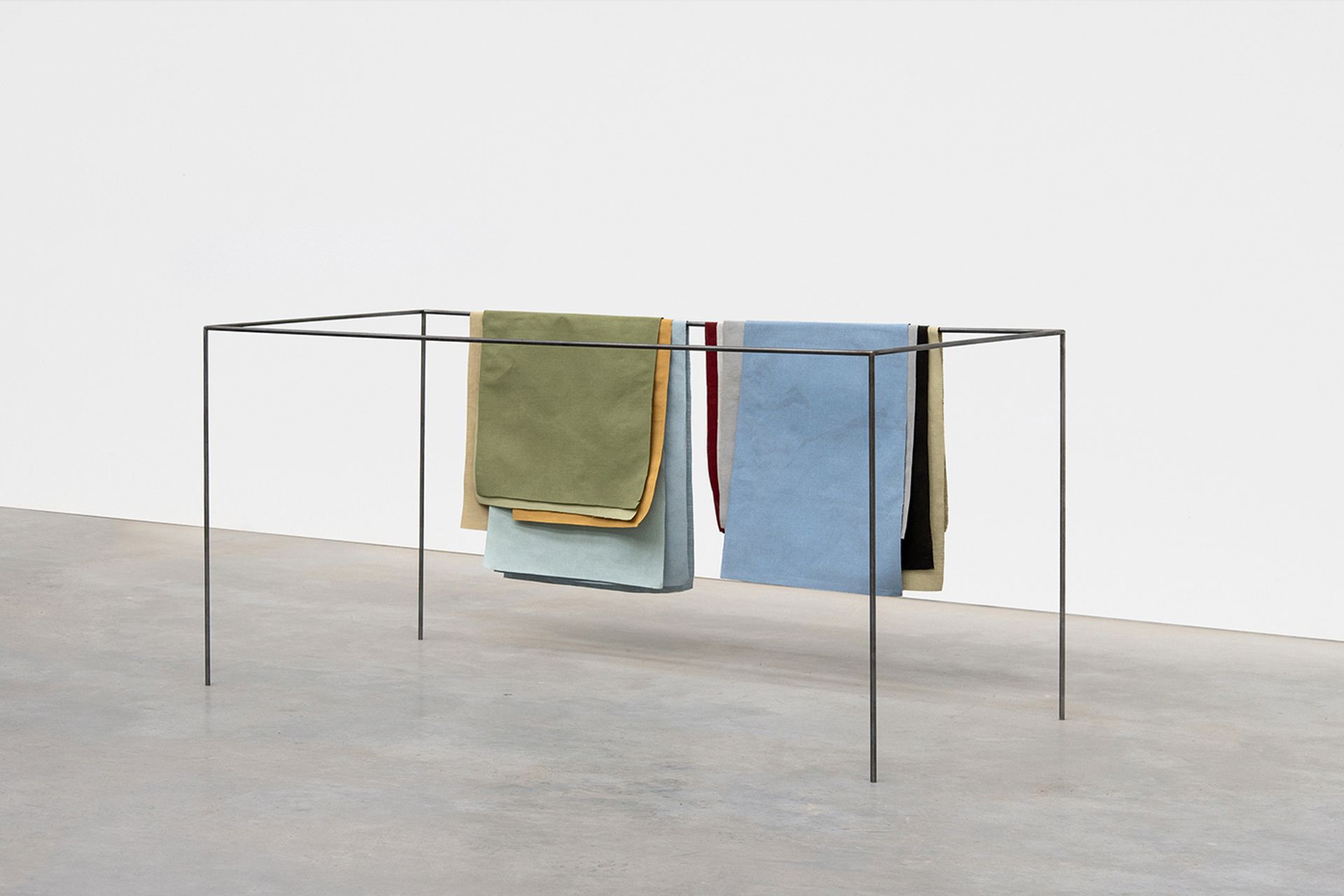 Manders also speaks of a time when he was “not allowed” to indulge his desire to use pedestals to display sculptures—and of another, when he struggled against the urge to introduce newspapers into his work as a material. Colour must abide by rules, too. Because a bathroom is typically white, he says, “there’s no freedom” in it. But since towels do not necessarily have that same colour default, he felt he could experiment with them; bronze casts of towels painted different hues thus became key elements in his sparse sculptural installation Isolated Bathroom (Composition with 4 colors) (2010-19), which he has described as a “three-dimensional painting”, and Table with Towels (1999-2023).