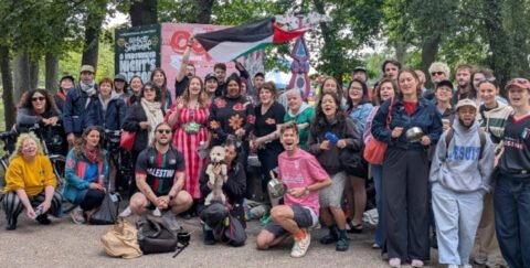 RF. Alvarez, We’re Still Here!, 2025. Acrylic on raw linen.