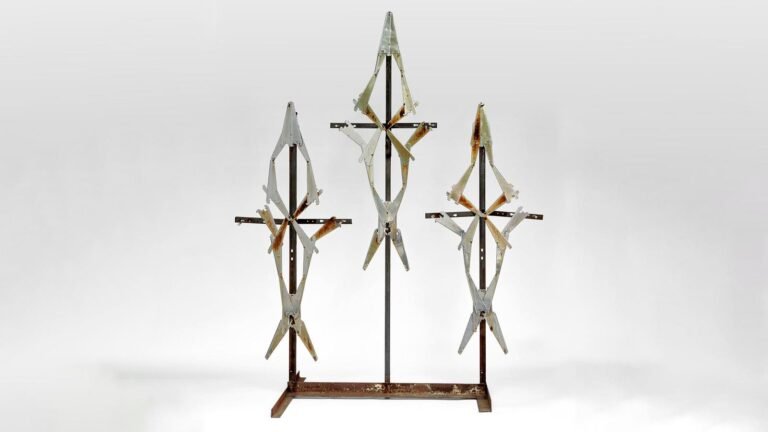 Industrial steel brackets are pierced by garage nails to reimagine Jesus being crucified on the hill of Calvary between two thieves, fulfilling Old Testament prophecy. One thief mocked Jesus, demanding salvation for the pair of thieves, while the other rebuked him, upholding their punishment and Jesus’ innocence. Rust represents blood to invoke suffering.
