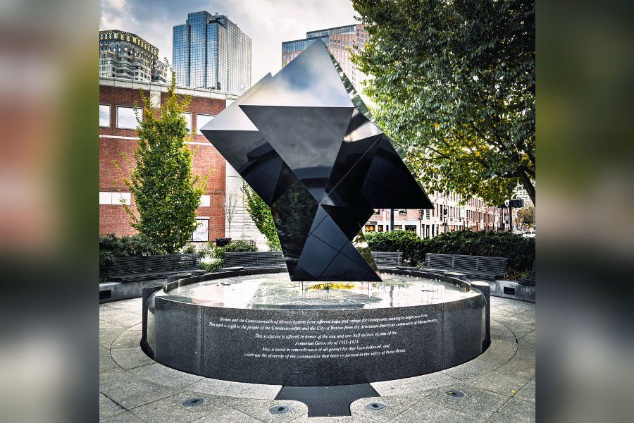 The reconfiguration represents all who were pulled away, or were forced to pull away, from their country of origin, who came to this country to start a new life. The Abstract Sculpture, as stated on the inscription on the Reflecting Pool upon which the Abstract Sculpture sits, is “offered in honor of the one and one-half million victims of the Armenian Genocide of 1915-1923. May it serve in remembrance of all genocides that have followed, and celebrate the diversity of the communities that have re-formed in the safety of these shores.”