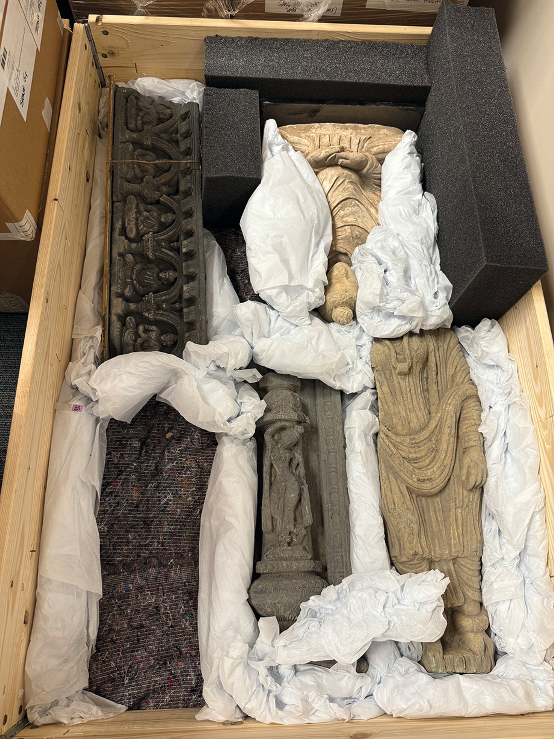 A box containing statues and friezes. All items have to be carefully unpacked, meticulously photographed, examined, logged and repacked for further analysis © OSCE