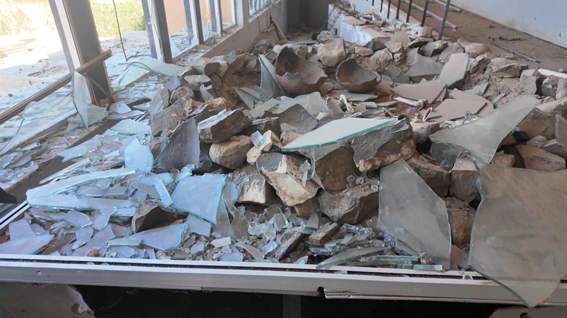 He describes the building’s structure as heavily damaged: its glass facade shattered, walls bearing marks from rocket strikes, and a large number of sniper casings scattered across the grounds. Elabdeen also notes that the larger storage facility was struck by a missile, damaging its structure and artefacts in at least one container.