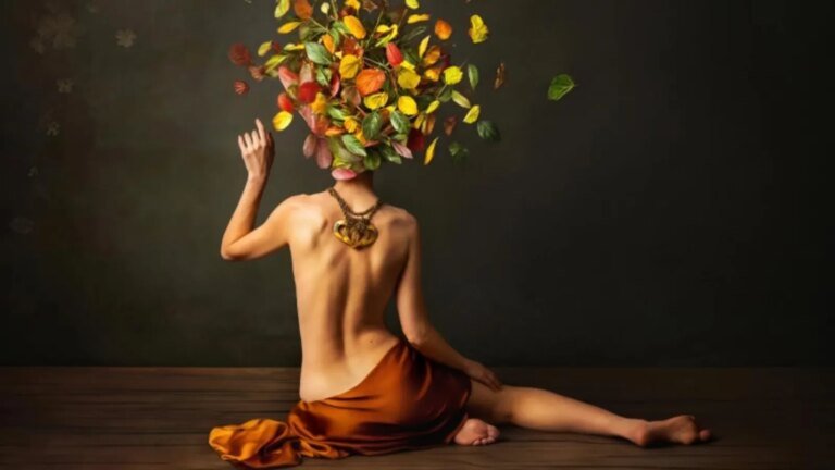 This portrait transcends the human form and merges with the natural cycle of the seasons. The figure of a woman, captured from behind in elegant nudity, celebrates vulnerability and inner strength. Her head, replaced by a crown of leaves in warm autumn hues, symbolizes connection with nature.