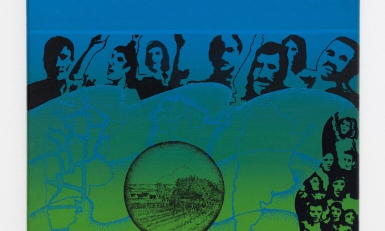 Across eight paintings, the presentation charts Cerrato’s evolution from gestural abstraction to her grid-based Epopeya del Ser Beta (The Epic of the Beta Being) series, the Maps and Multitudes series juxtaposing maps and generic groups of people, and finally her El sueño de la casita propia (The dream of owning a little house) works featuring crowds, fragments of maps and landscapes, and images of rural homes set against bright colour gradients.