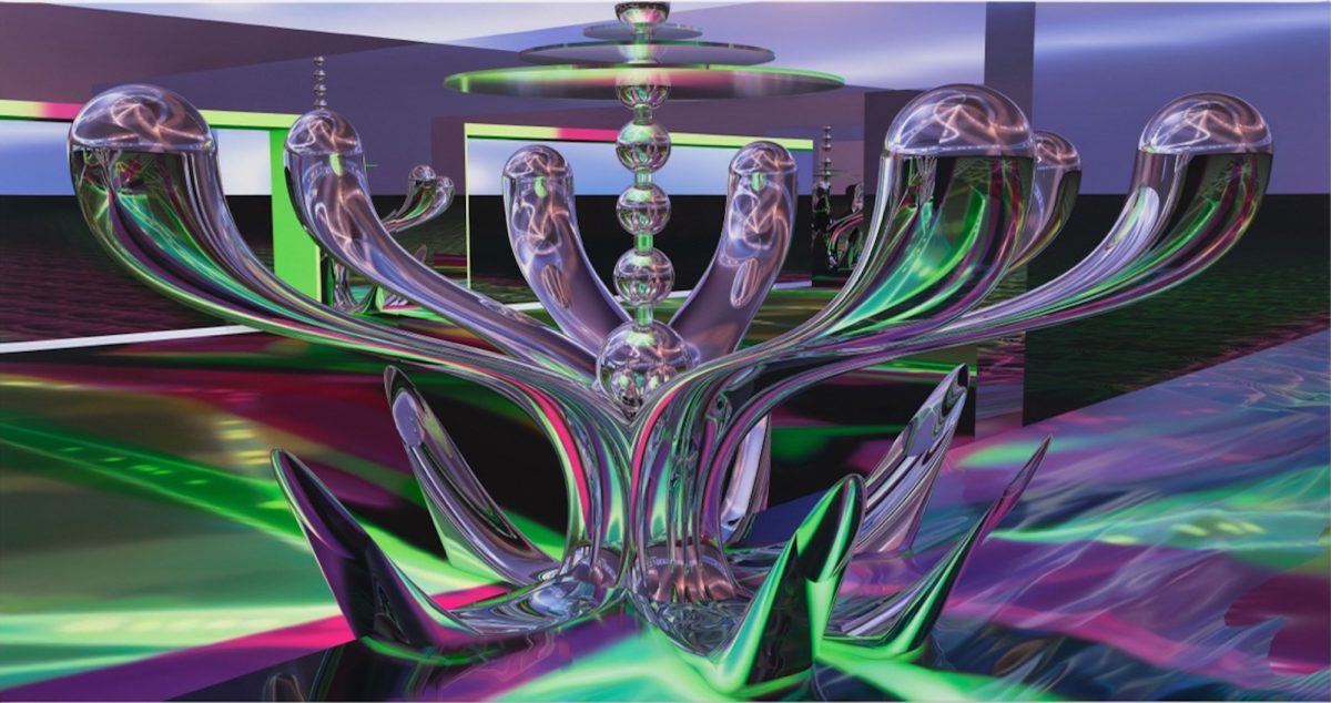 To build these virtual worlds, Khoury uses Cinema 4D and Rhino, architectural software that lets her specify exact lighting conditions — “Egypt 1948, 10:30 PM,” for example —and combine impossible materials that push the software beyond its limits. The resulting computational glitches become integral to her aesthetic. “I’m essentially creating these vast spaces with my own materials,” she said, demonstrating her process on a laptop. “What if I made this chrome and this translucent glass? Or half chrome, half glass?”