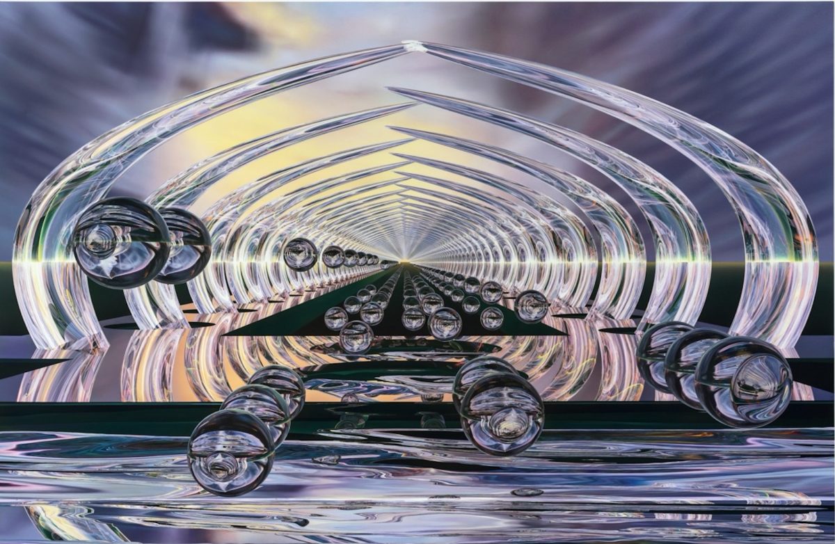 Her work aligns with the 21st-century movement known as devirtualization, the translation of virtual concepts and digital culture into physical form through traditional techniques. The paintings in the exhibition feature the ctenophore (or comb jelly) as a recurring motif — a bioluminescent marine invertebrate dating back 740 million years. It resembles digital ectoplasm, serving as a light source throughout Khoury’s digital skies. Its ancient-yet-futuristic appearance makes it an ideal emblem for work exploring consciousness, perception, and form.