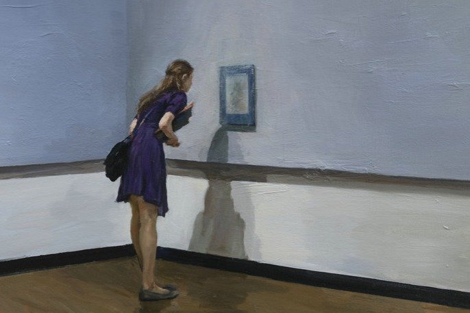 The works show few, or mostly, no audience at all, but paintings on the walls. The audience’s attention is drawn to the harmonious use of colors and the way he frames the walls, floors and ceilings to accentuate a compositional beauty. He creates a beauty of simplicity and muteness.