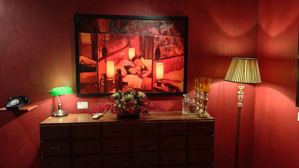 At the Delhi exhibition, a foldable three-part mirror with a settee in front invites guests to look inwards, mirroring a painting where two lovers are caught passionately making out, reflected in a mirror. The concept urges viewers to peer into the two lovers’ entangled lives and passion. The design also had a dinner table set for four, and telephones, reminding viewers of the film’s set.