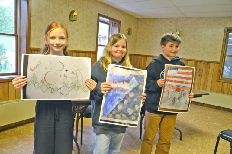 From left, Ada Popp, 11, Lilly Niederbuhl, 10, and Loki Vega, 11, the top three finalists in the local VFW auxiliary’s “Illustrating America” art contest, show off their patriotic paintings on Tuesday. Vega’s creation placed second in the state competition.