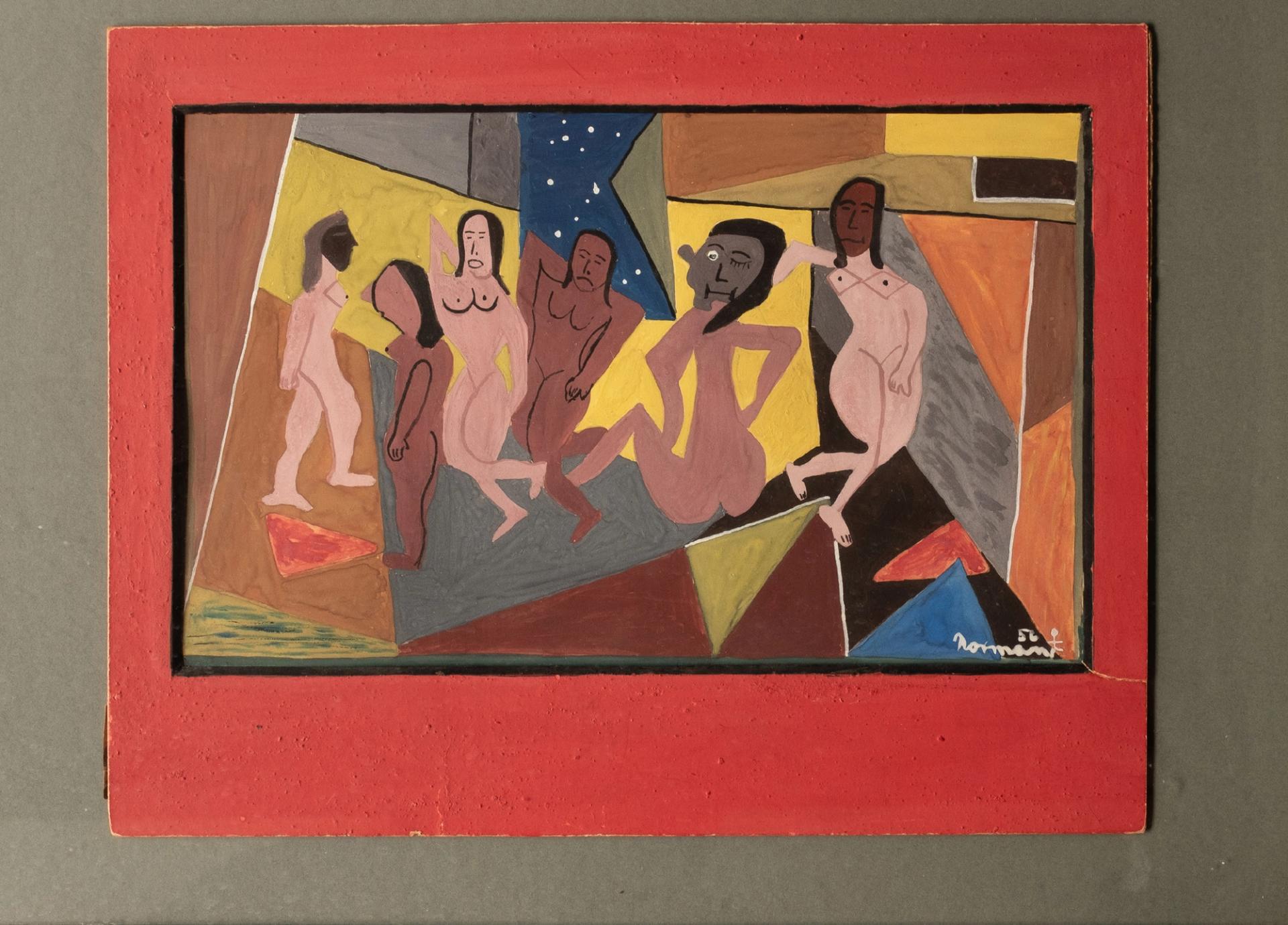 Of two works cited by the operations manager, one shows a car with “Drug1” as a numberplate, with groups of people around it including a policeman. Its dedication reads: “To Dick A small gift—which I painted in Wandsworth Prison!! Which somehow goes to prove that WALLS DO NOT A PRISON MAKE NOR IRON BARS A CAGE.” – July 1961. Dick was Dick Watts Jnr., the theatre critic of The New York Post and a close friend of the artist. The other is a riff on Picasso’s Les Demoiselles d’Avignon, titled After Picasso: Les Demoiselles de Soho showing nude figures on a Cubist background.