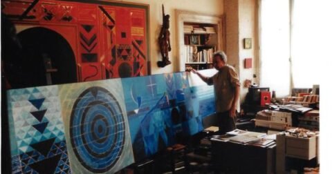 The ten paintings that were “banned” from The Clink date from 1955 to 1965, and are in varying styles, from faux-naïve depictions of parties to abstracts in the style of Joan Miró. They are not for sale, and had remained with Frank and then Geraldine until recently when some were given to members of the family.