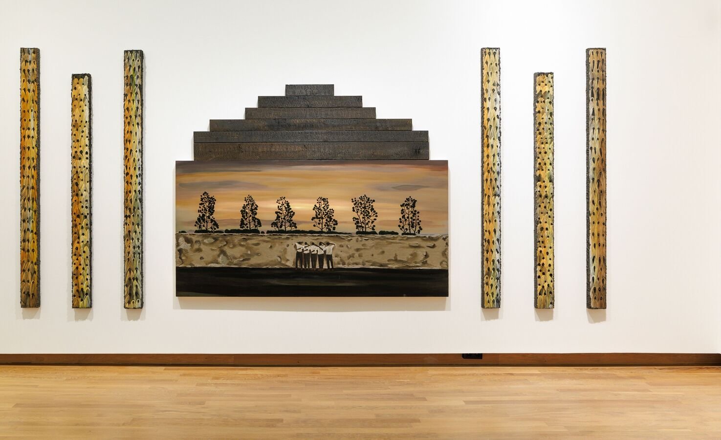 Hisham skilfully employs the strategy of spectrality to address sociopolitical concerns of erasure of identity, displacement and discord. Apart from these large sculptural paintings and small paintings, there is also a site-specific installation of 12 carved pillars acting as a barricade or a “wall” in front of the display. The viewers experience the paintings through apertures in between the pillars. Through experimentation in space, scale, sequencing and material interventions, Hisham builds and steers the flow of the narrative with a deft curatorial imagination. “The entire exhibition space, with the large and small paintings, forms one art work,” says Hisham. “It is like entering into somebody’s mindspace, the pillars are like physical forms of thoughts, and the paintings are projections of moments. I am re-creating a kind of an ancient relic or a ruined architectural interior space.”
